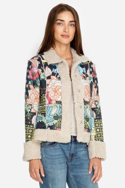 A colorful symphony of patchwork designs gives our Deruy Sherpa Coat the perfect amount of boho-inspired appeal. Colorful floral designs dance alongside vibrant lines and geometric shapes to give this cozy coat a head-turning touch. Super-soft Sherpa adorns the sleeves, collar and hem to make this trendy coat extra comfy and endlessly cozy. Wear it with your favorite ensemble to stay warm and stylish all at once.